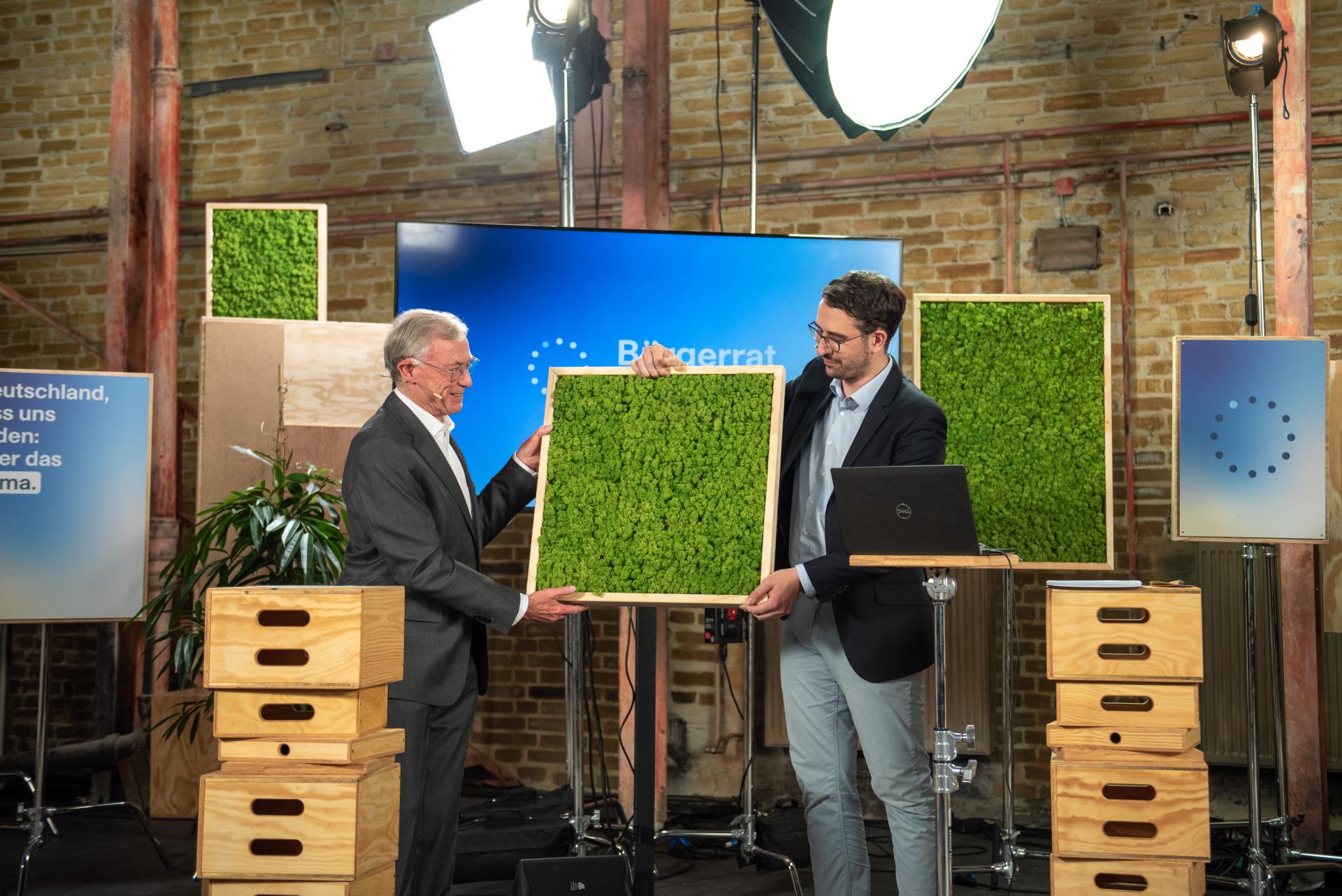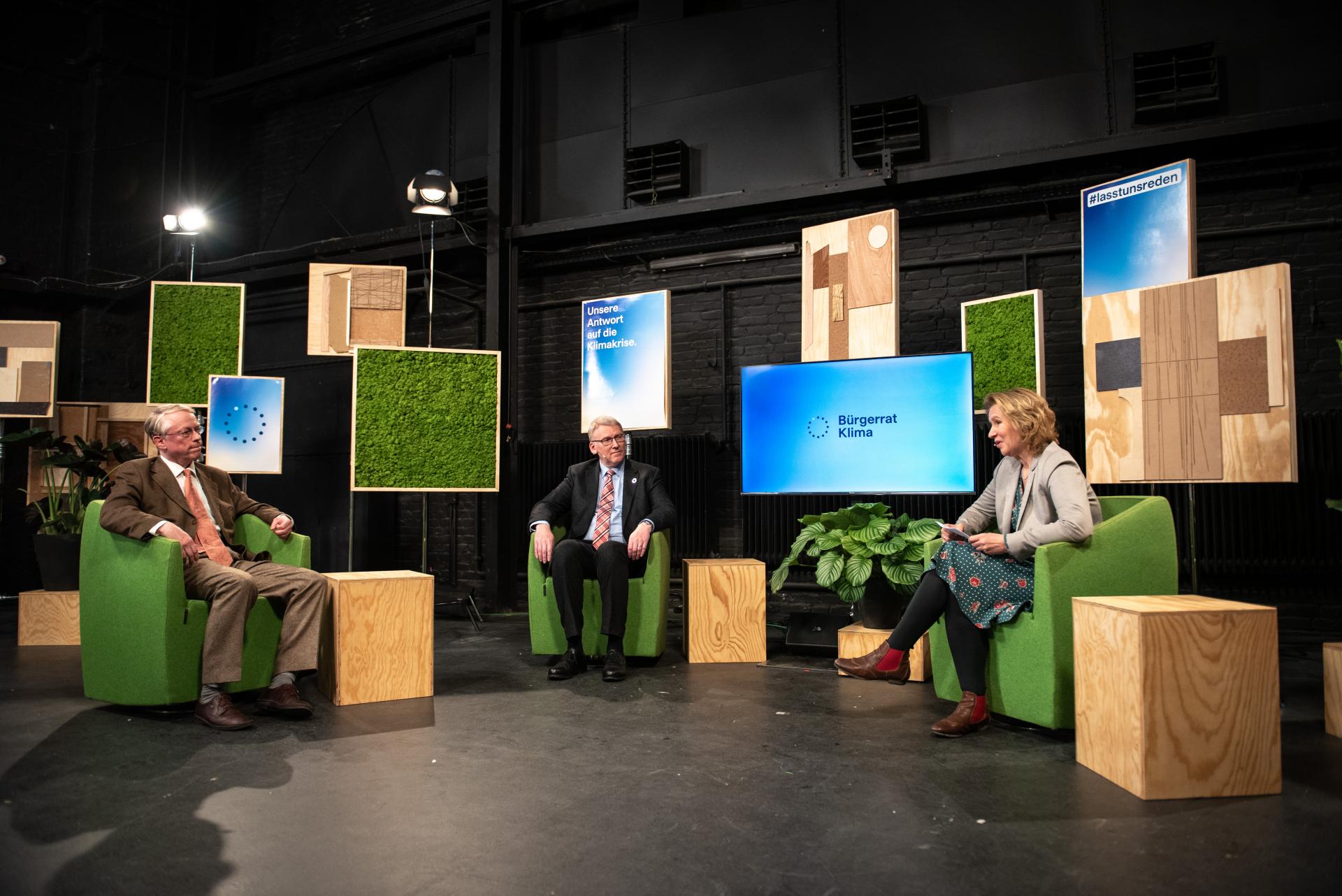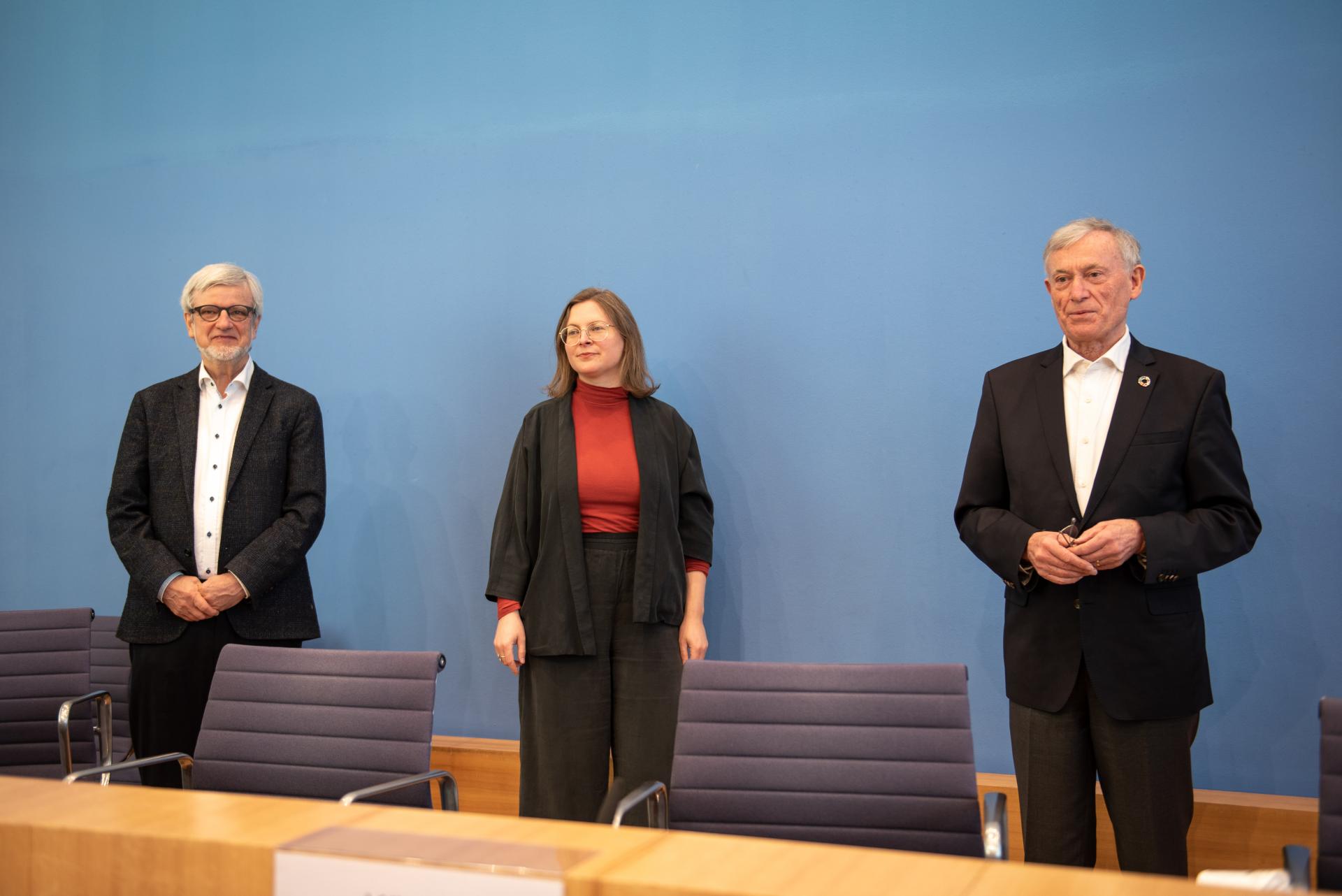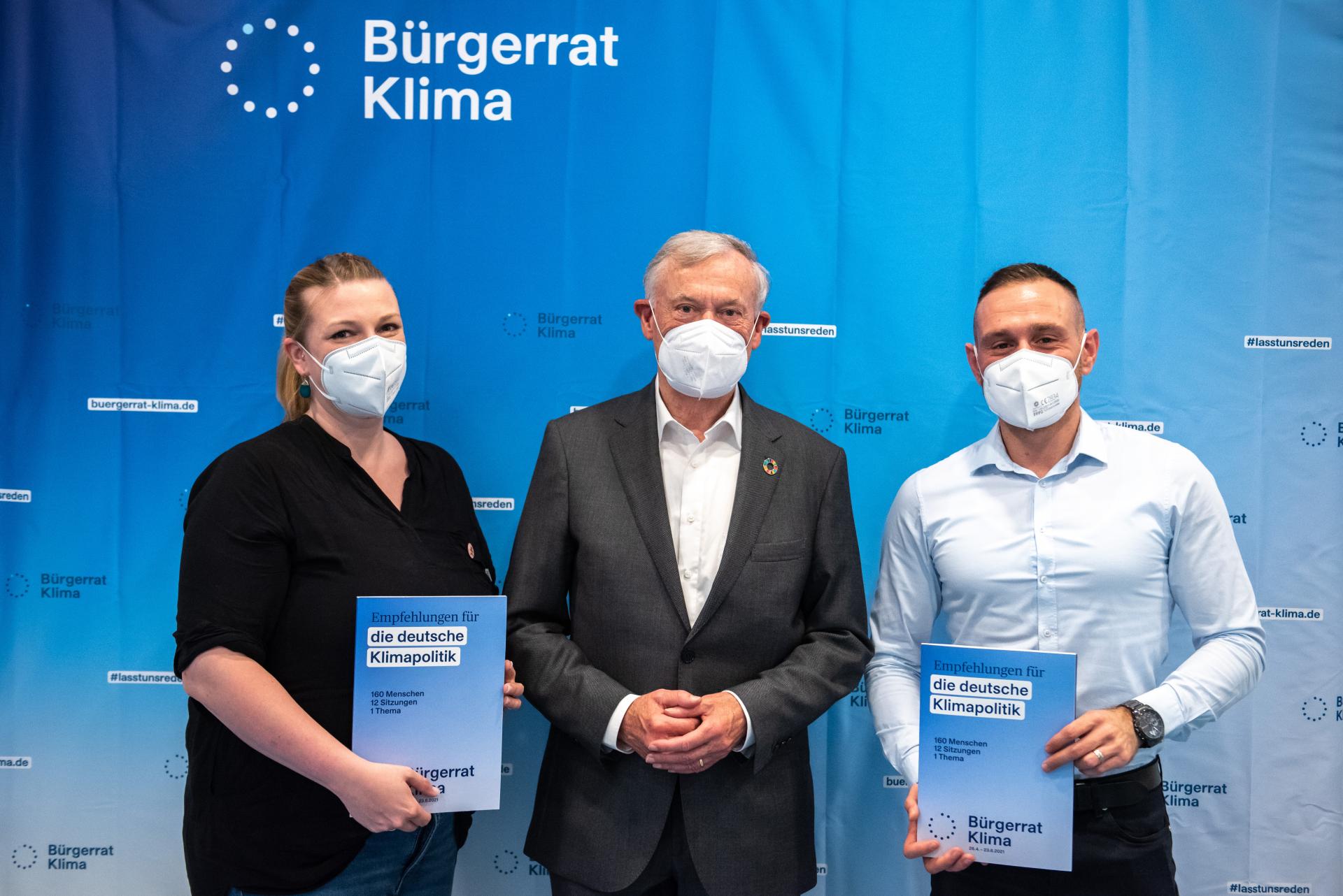 Bürgerrat Klima präsentiert Ergebnisse: Schirmherr Horst Köhler und die Teilnehmenden Mareike Menneckemeyer und Adnan Arslan, Foto: Robert Boden
