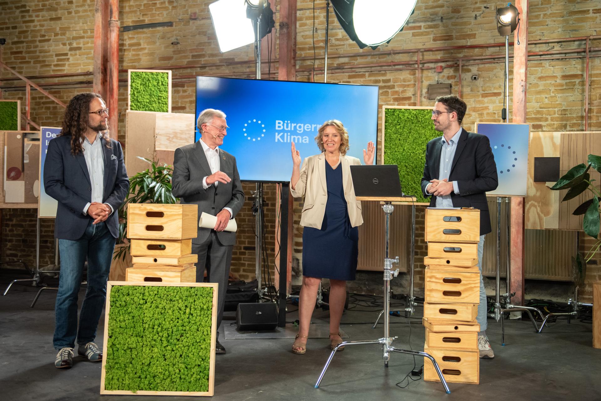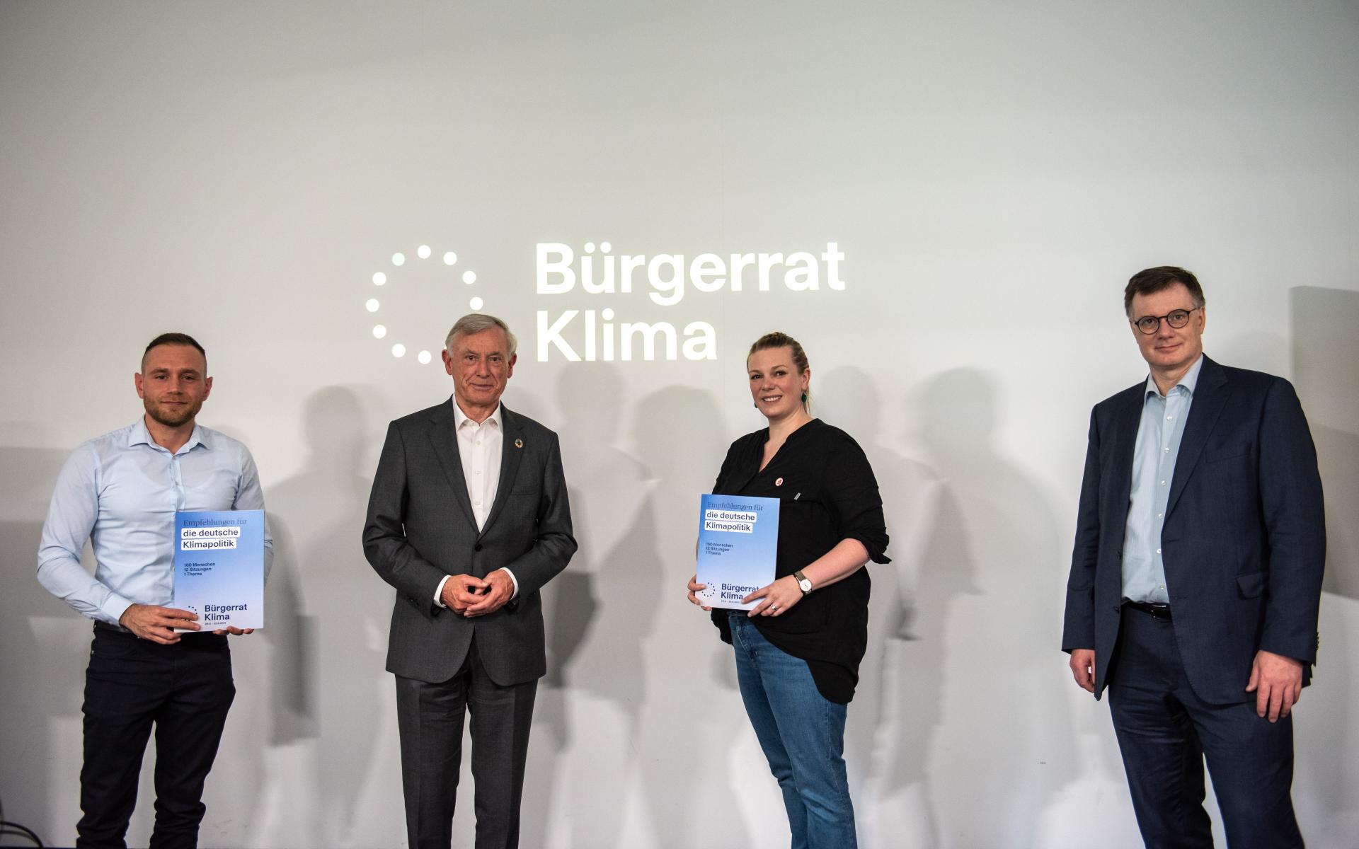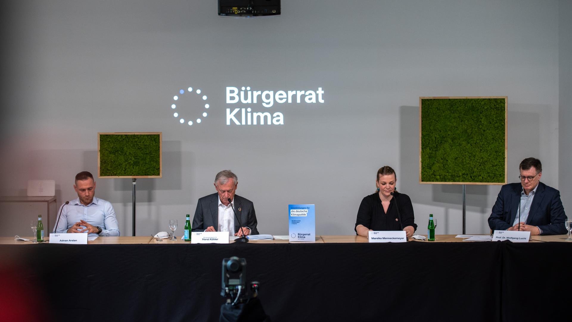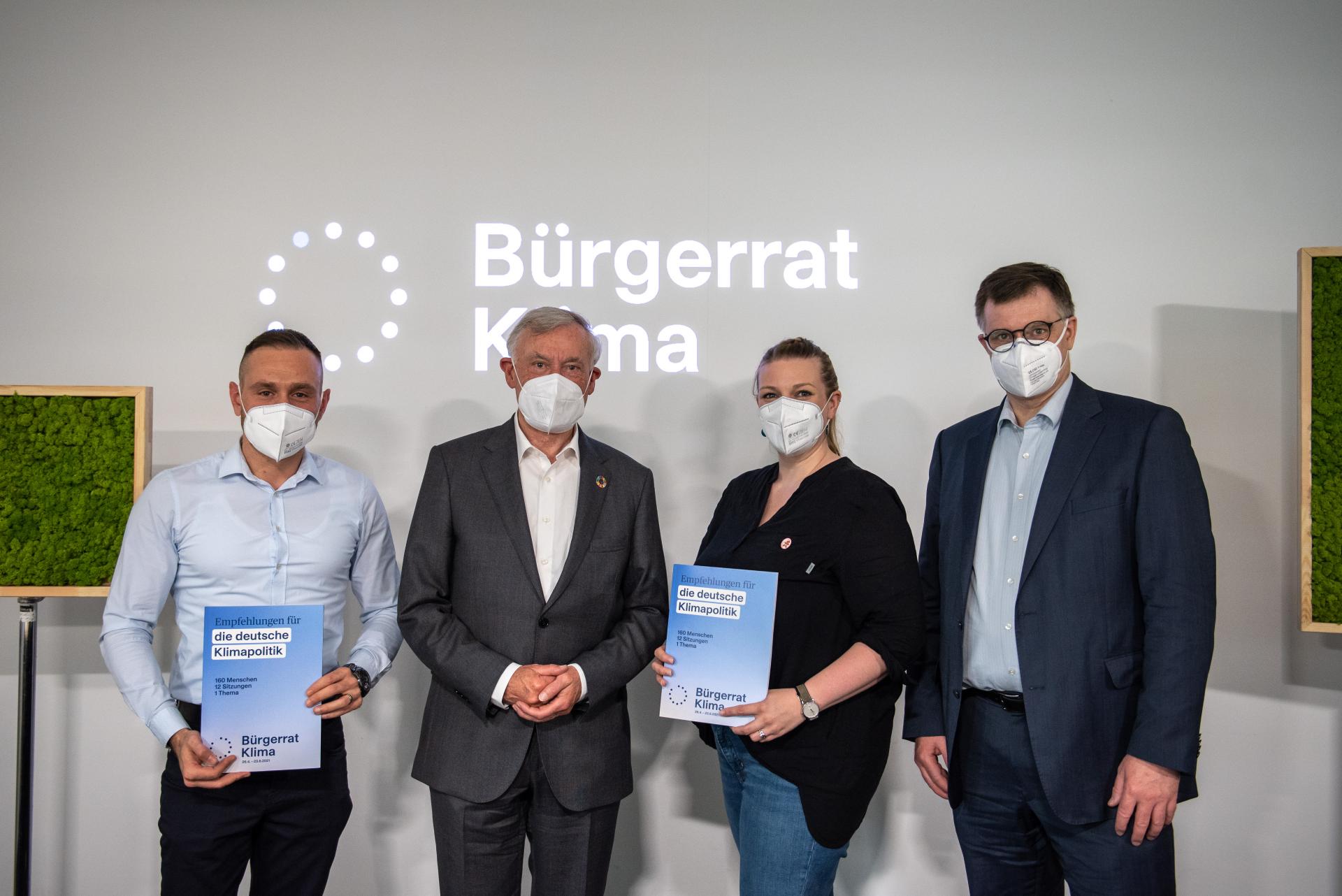 Bürgerrat Klima präsentiert Ergebnisse, v.l.n.r. Adnan Arslan, Schirmherr Horst Köhler, Mareike Menneckemeyer, Wolfgang Lucht, Foto: Robert Boden
